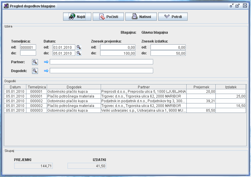 Pregled dogodkov gotovinske blagajne omogoča podroben prikaz prometa blagajne glede na datum, znesek, temeljnico, partnerja ali dogodek.