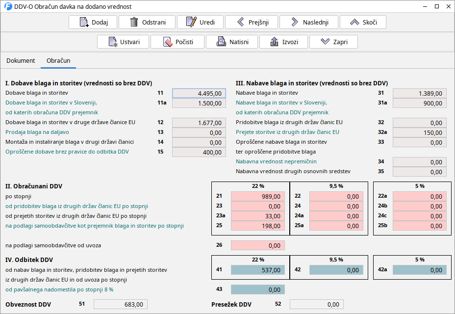 Obrazec DDV-O vsebuje podatke o dobavah in nabavah blaga in storitev ter obračunanem in odbitnem DDV.