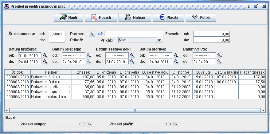 Preverite lahko podatke o prejetih računih (zneski, datumi) in stanje prejetih računov (plačan, neplačan, delno plačan,...).