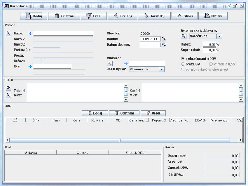 Modul Naročila omogoča sestavo obrazcev naročilnica in naročilo kupca.