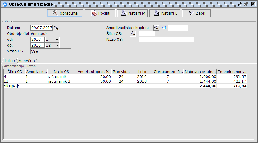 Obračun amortizacije omogoča izdelavo obračuna glede na podatke iz registra osnovnih sredstev.