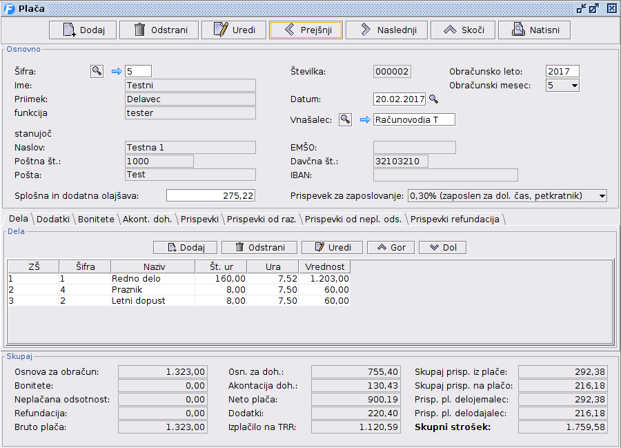 V kolikor imate pravilno nastavljene šifrante, je obračun pripravljen takoj. Dovolj je vnos postavke dela ter dodatkov in obračun plače je zaključen.