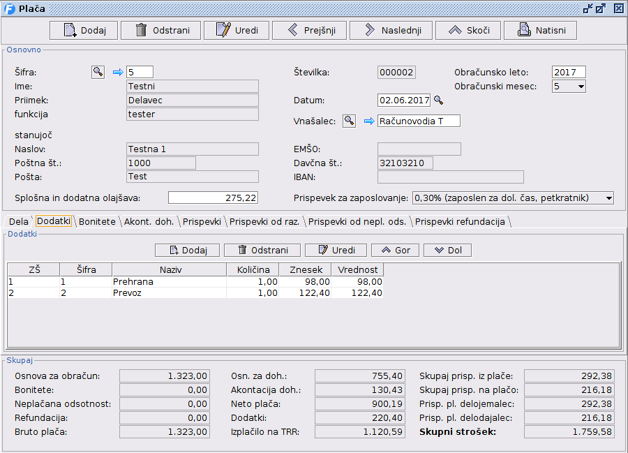 Obračun omogoča tudi dodajanje bonitet, izračun prispevkov od razlike do minimalne plače, prispevkov od neplačane odsotnosti in prispevkov od refundacij.