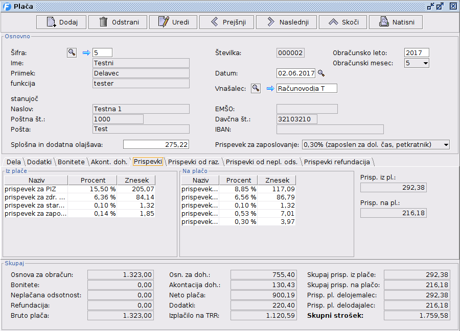 Akontacija dohodnine in prispevki se v programu obračunajo avtomatsko.