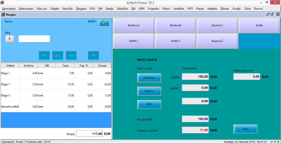 Izbira plačila je preprosta, s klikom ali (po potrebi) z vnosom zneska zaključite in natisnete račun.