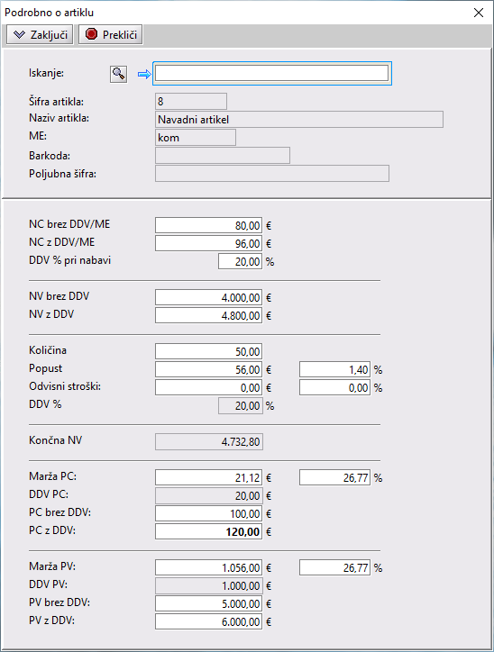 Vnesti je potrebno le še nabavno ceno/vrednost ter popust in marža se bo obračunala avtomatsko. Maržo, popuste in odvisne stroške lahko vnesete v zneskih ali procentih. Ob spremembi enega polja, se avtomatsko preračunajo tudi vse ostale vrednosti na obrazcu.