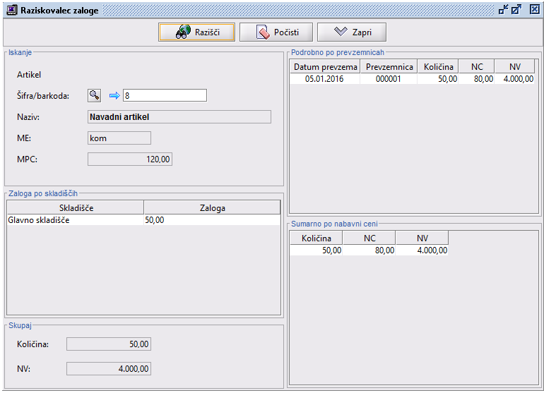 Raziskovalec zaloge vam ponuja informacijo o zalogi posameznega artikla. Prikaže vam zalogo po skladiščih in povezane prevzemnice s količinami in nabavnimi cenami.