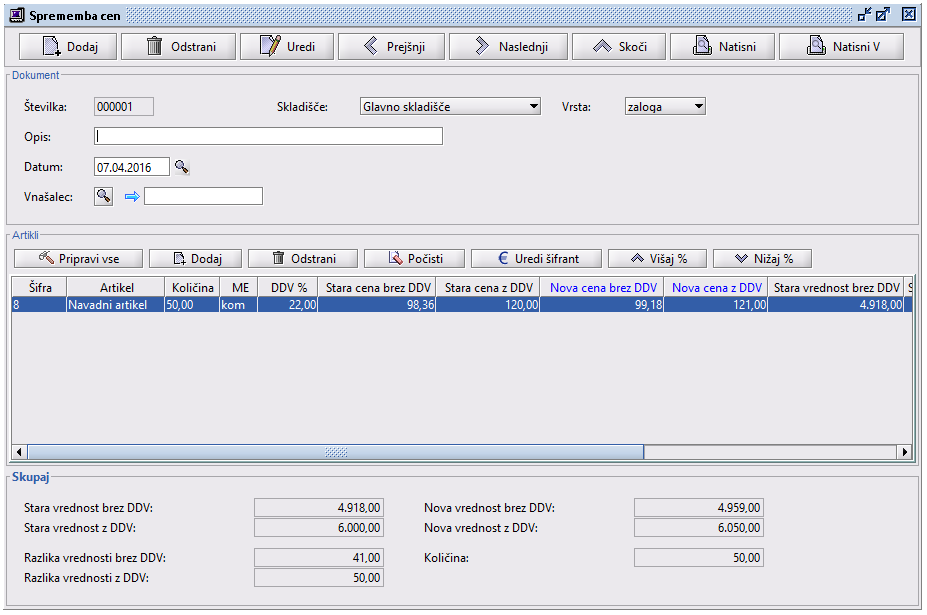 Sprememba cen je dokumentirana, poleg obrazca o spremembi cen se spremenijo tudi cene v šifrantu artiklov.