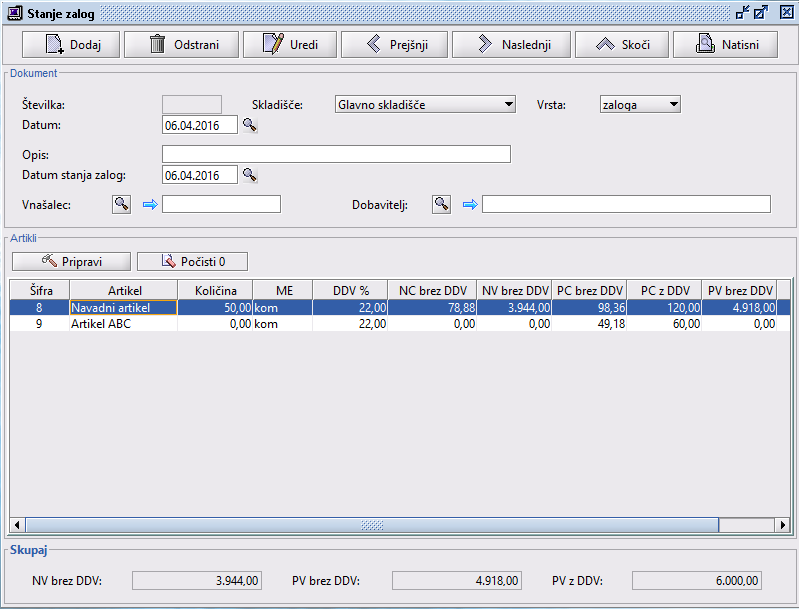 Pri obrazcu stanje zalog izdelamo posnetek stanja zalog na določen dan.
